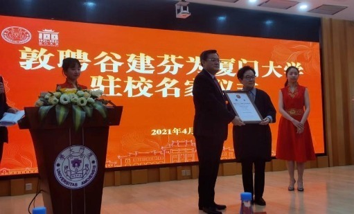 圖為時任廈門大學校長、現任廈門大學黨委書記張榮在廈門大學百年校慶之日為谷建芬頒發“駐校名家”證書