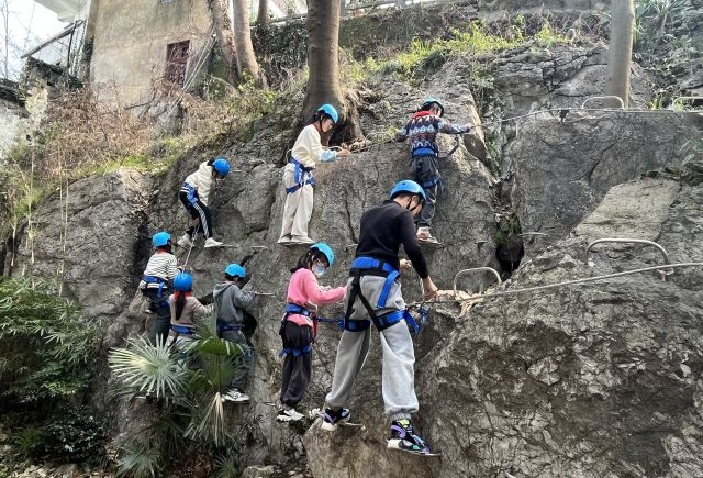 在紫陽(yáng)小學(xué)的體育課和大課間,學(xué)生們不再進(jìn)行跑步、跳繩等傳統(tǒng)項(xiàng)目,而是通過(guò)嵌入式體育場(chǎng)地和活動(dòng),在挑戰(zhàn)中鍛煉身體、培養(yǎng)意志品質(zhì)。依山而建的攀巖項(xiàng)目“飛拉達(dá)”要求孩子們徒手在陡峭的巖壁上攀爬數(shù)十米,這不僅鍛煉了學(xué)生的力量、耐力和協(xié)調(diào)性,還培養(yǎng)了他們的團(tuán)隊(duì)協(xié)作能力和面對(duì)困難的勇氣。基于校園大樹(shù)設(shè)置的“樹(shù)上探險(xiǎn)”項(xiàng)目,在保證安全的條件下讓學(xué)生們?cè)诿艿?/span>高空樹(shù)林中穿梭,充分提高了他們的身體靈活性和應(yīng)變能力。“高空緩降”項(xiàng)目不僅鍛煉了學(xué)生們的平衡能力,而且提升了他們身處險(xiǎn)境時(shí)的冷靜分析能力和自救能力。基于校園特殊地理環(huán)境設(shè)置的“書(shū)院定向”項(xiàng)目,要求學(xué)生通過(guò)專業(yè)定向地圖和指南針,完成一系列運(yùn)動(dòng)挑戰(zhàn),該項(xiàng)目不僅鍛煉了學(xué)生的身體,還培養(yǎng)了他們的空間思維和觀察力。