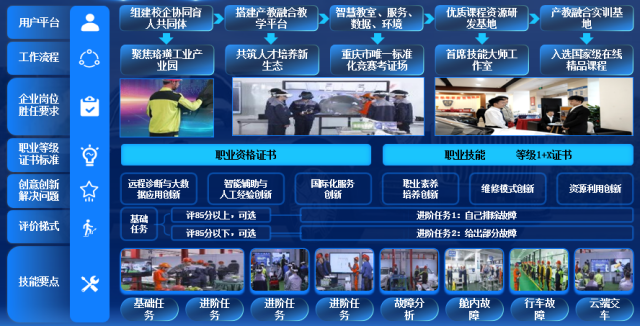 搭建實體型、虛仿型產教融合教學平臺。打造產教融合實訓基地和仿真實訓基地,構建“智慧教室、服務、數據、環境”四大平臺,依托市級示范性虛擬仿真實訓基地,改造50個VR/AR工位,實現“高端化、智能化、綠色化”貫通。建成重慶市唯一標準化競賽考證場、優質課程資源研發基地、首席技能大師工作室及裝備制造技能教師培訓基地。