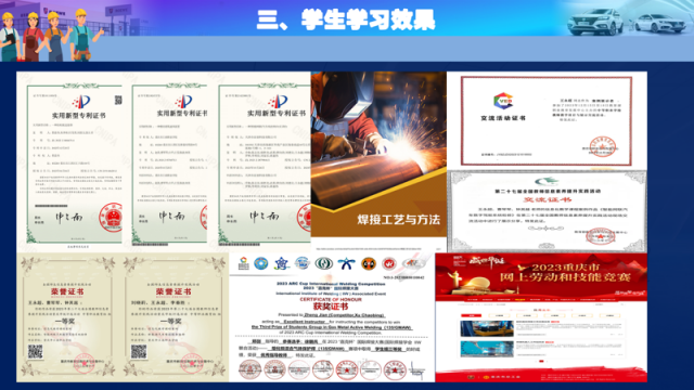 產教協同成果豐碩:累計發表相關論文15篇,出版專著2部,主持教育部重點課題1項(已結題)。校企聯合開發實訓小程序24個,取得發明專利14項建成市級示范性虛擬仿真實訓基地,制定人才培養標準在全市推廣。教師出版專著2部,發表論文15篇,出版教材10本,建成市級職業教育專業教學資源庫2個、市級在線精品課程5門、市級示范性虛擬仿真實訓基地1個、市級微課比賽獲獎59人次(全市排名第二)。中高貫通培養2560人,開發中高職銜接課程16門,建成資源庫1個,新增國規教材3本、國家在線精品課程1門,全國教學設計案例交流展示7個(數量全市第一)。編寫《焊接技術應用專業人才培養指導方案》《焊接技術應用專業核心課程標準》在全市推廣并公開出版。方向課程《焊接工藝與方法》是重慶市中職學校課程思政示范建設課程,重慶市中等職業精品在線開放重點課程。