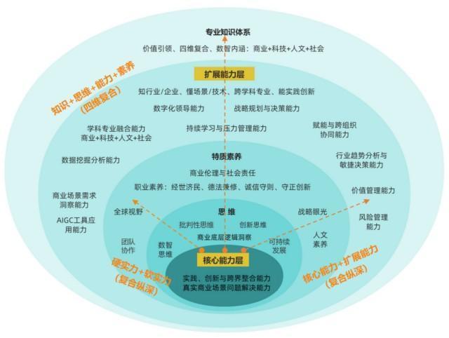 在此基礎(chǔ)上,學(xué)院構(gòu)建了以核心能力層與擴(kuò)展能力層為主線(xiàn),“知識(shí)+思維+能力+價(jià)值觀(guān)”四維復(fù)合的新型能力圖譜。這一圖譜不僅強(qiáng)調(diào)對(duì)實(shí)踐能力、創(chuàng)新能力、跨界整合能力及真實(shí)商業(yè)場(chǎng)景問(wèn)題解決能力的培養(yǎng),更將科技向善、責(zé)任感、誠(chéng)信和對(duì)社會(huì)福祉的貢獻(xiàn)等核心價(jià)值觀(guān),內(nèi)化為學(xué)生商業(yè)決策能力框架的有機(jī)組成部分,確保了人才培養(yǎng)的全面性與可持續(xù)性。