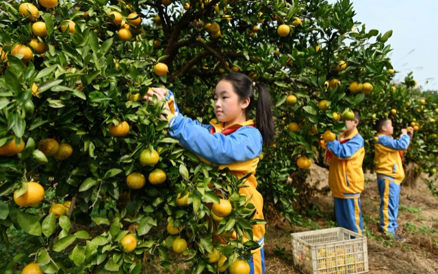 10月30日,湖南省邵陽市洞口縣文昌街道第一小學組織學生到附近柑橘園采摘柑橘,體驗勞動的樂趣與艱辛,引導學生從小熱愛勞動,樹立勞動光榮的美德。中國教育報-中國教育新聞網通訊員 滕治中 攝