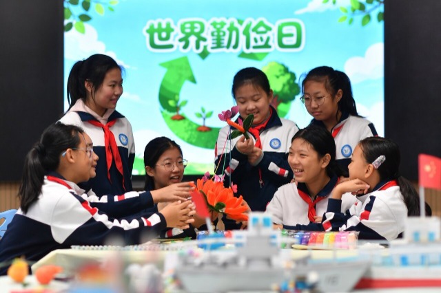 10月31日是世界勤儉日,山東省青島市市北區(qū)鄭州路小學開展“變廢為寶倡節(jié)約”主題教育活動,孩子們通過利用廢舊物品手工制作、節(jié)約糧食話勤儉等多項內容,以實際行動變廢為寶,養(yǎng)成勤儉節(jié)約的好習慣。中國教育報-中國教育新聞網通訊員 王海濱 攝