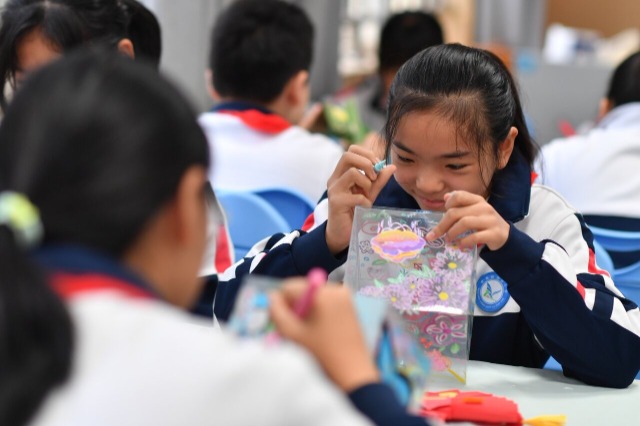 學生利用廢舊物品制作紙盤畫。通訊員 王海濱 攝