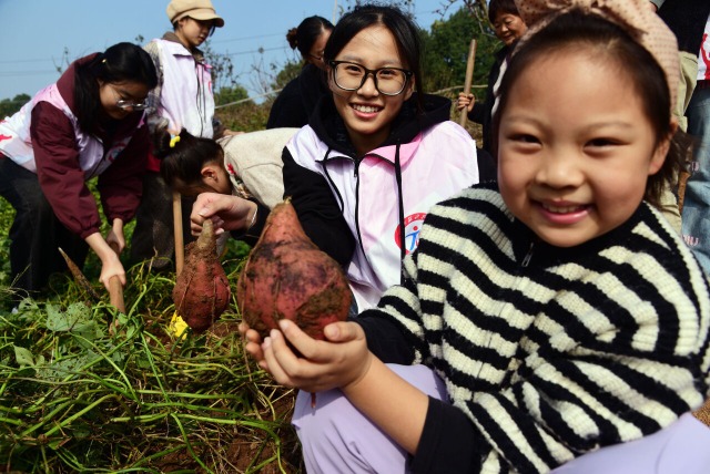 志愿者帶著小朋友體驗刨紅薯 石玉成 攝