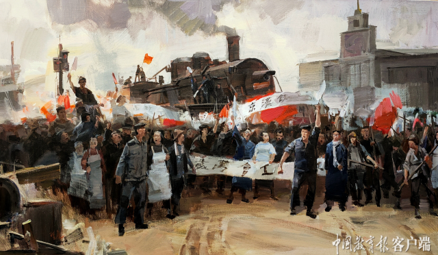 上應(yīng)師生開展“黨史故事繪”活動,圖為該校李哲虎教授創(chuàng)作的布面油畫《京漢鐵路工人大罷工》