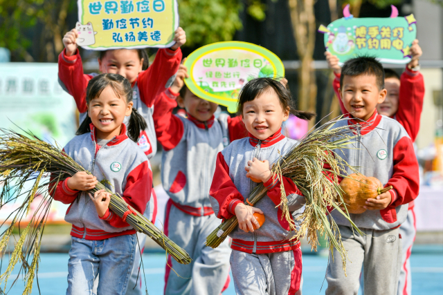 10月29日,浙江省長興縣泗安鎮中心幼兒園的孩子們正在參加快樂運糧食活動。當日,長興縣泗安鎮中心幼兒園開展勤儉節約主題活動,青年文明號團員教師與孩子們一起參加手繪勤儉標識、快樂運糧食、玩轉科創作品等活動,學習尊重勞動、愛糧惜糧的傳統美德,感悟農耕文化,將勤儉節約理念扎根童心。譚云俸 攝