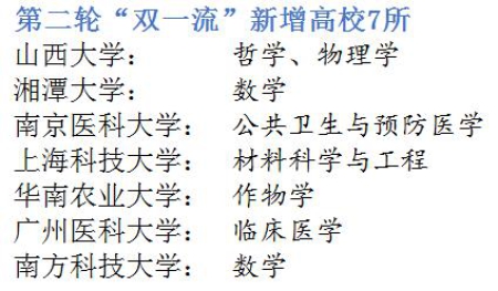 中國教育報-中國教育新聞網北京2月14日訊(記者 唐琪)記者今天從教育部獲悉,第二輪“雙一流”建設高校及建設學科名單公布,共有建設高校147所。其中,山西大學、湘潭大學、南京醫科大學、上海科技大學、華南農業大學、廣州醫科大學、南方科技大學等7所高校的8個專業新增入選第二輪“雙一流”建設高校及建設學科名單。