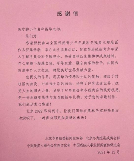 北京冬奧組委感謝仁愛學(xué)校的老師積極帶領(lǐng)孩子們參與全國(guó)殘疾青少年冬奧會(huì)和冬殘奧會(huì)主題繪畫作品征集活動(dòng)。感謝小作者們用真摯的情感和生動(dòng)的筆觸描繪出對(duì)祖國(guó)的熱愛、對(duì)幸福生活的向往。