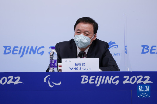 3月13日,北京冬奧組委副主席楊樹安在北京冬奧組委在北京冬殘奧會主新聞中心召開的賽事總結新聞發布會上發言。新華社記者許雅楠攝