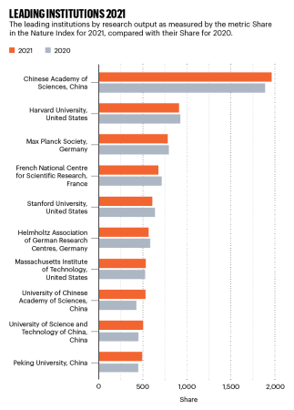 中國科學院在自然指數中繼續居于機構榜單之首,其份額是排名第二的哈佛大學的兩倍多。根據此前發布的自然指數數據,中科院已連續10年位列該排行榜全球第一。