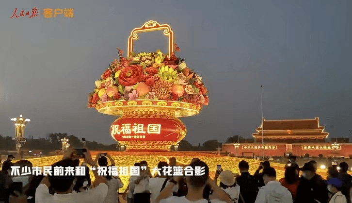天安門廣場巨型花籃亮燈,14組立體花壇在長安街沿線亮相。與國旗合影,巧手喜迎國慶,聆聽四史故事,歌唱祖國……