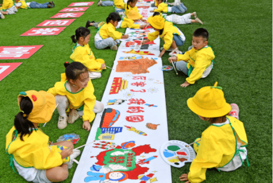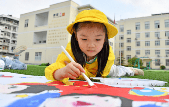 9月29日,浙江省臺州市仙居縣春暉幼兒園的孩子們正在畫布上繪畫。當日,仙居縣春暉幼兒園開展“童心永向黨 喜迎二十大”慶國慶主題繪畫活動。孩子們用手中的畫筆繪出五星紅旗、天安門等圖案,表達對祖國的熱愛和祝福,慶祝國慶。