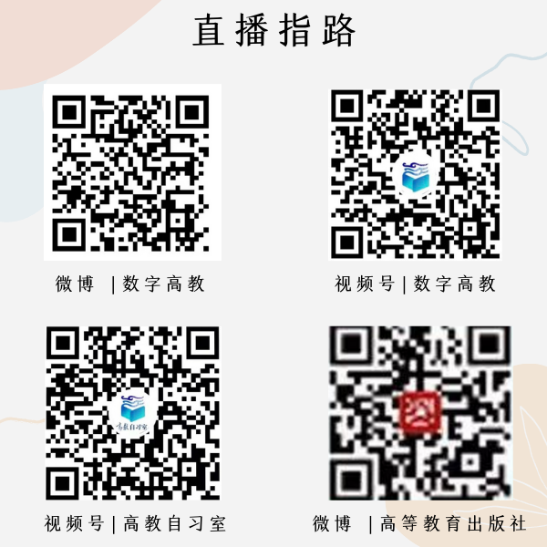 此次活動(dòng)將通過數(shù)字高教視頻號(hào)、數(shù)字高教微博、高教自習(xí)室視頻號(hào)、高等教育出版社官方微博進(jìn)行全網(wǎng)直播,掃碼即可觀看。