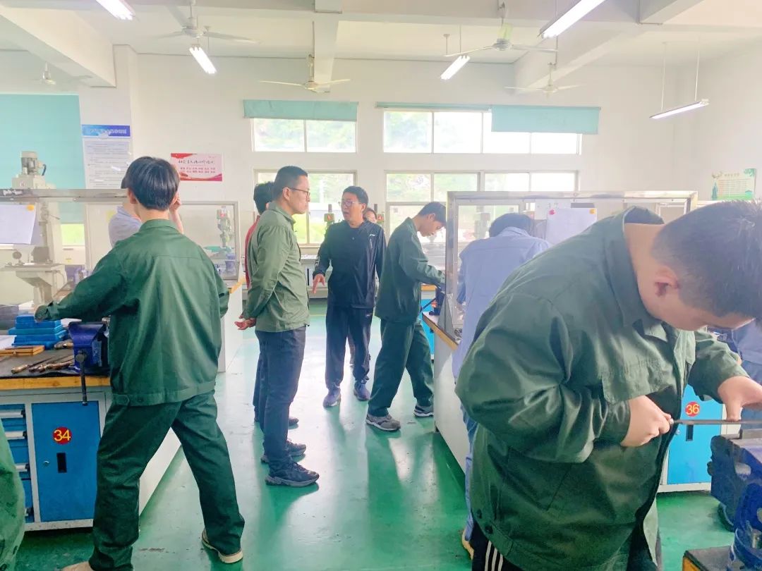 2022年5月24日,臺州職業技術學院中德學院院長林君煥、副院長楊建西一行蒞臨椒江職業中專實地指導工作。