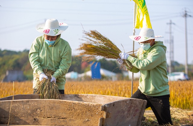 隨后,農(nóng)忙收割比賽拉開(kāi)帷幕。同學(xué)們共分成7個(gè)代表隊(duì),在講解示范完割稻子的過(guò)程、握鐮刀的方法及注意事項(xiàng)后,大家手揮鐮刀、分工協(xié)作,開(kāi)始下田割稻及打谷。雖然動(dòng)作生疏,過(guò)程辛苦,但是大家臉上都洋溢著收獲的喜悅。