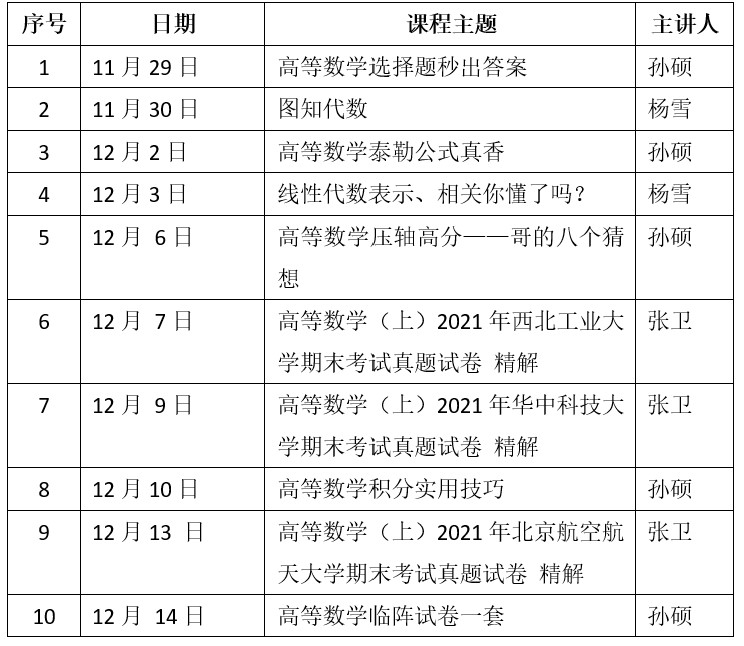 “高等數學(上)期末訓練營”針對高等院校期末高數考試重點、難點進行復習與強化,在講授實用技巧的同時精講西北工業大學、華中科技大學、北京航空航天大學的期末考試真題,幫助同學們總結期末高頻考點,提升應試能力。特邀三位深受大學生歡迎的數學名師作為主講嘉賓,他們分別是:已幫助數百萬學生通過高數考試、克服恐“高”癥的天津工業大學副教授孫碩,深入了解大學生學習的痛點難點、讓“枯燥”的課程學起來不枯不燥的楊雪老師,長期從事考研數學教學工作、目前已幫助數十萬學生考研上岸的考研數學名師張衛。