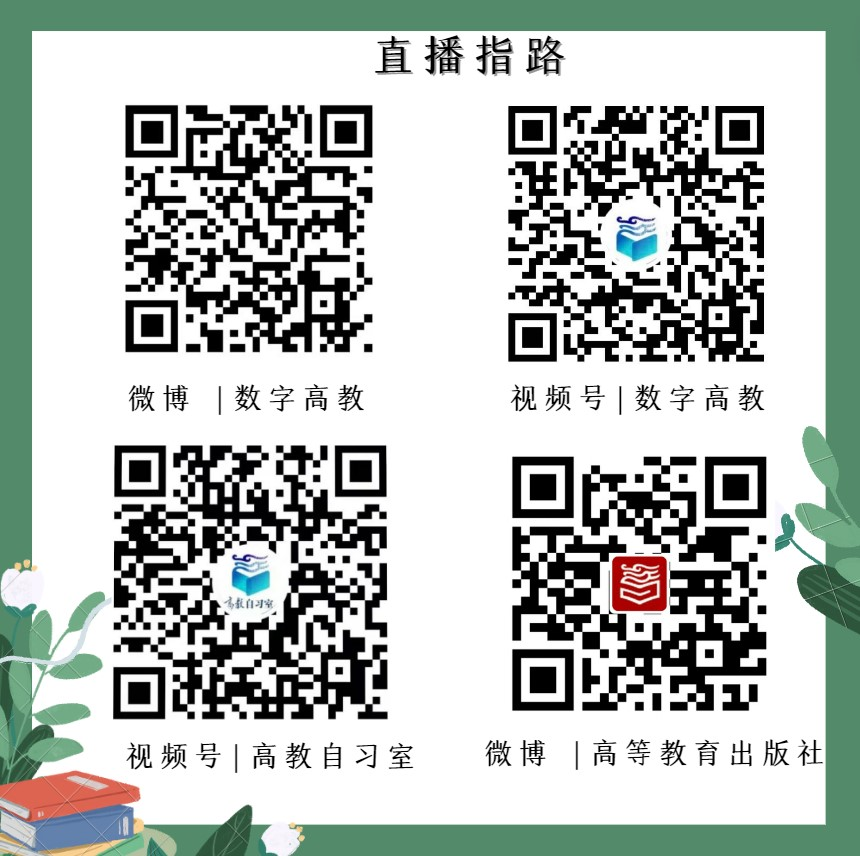 本次活動將通過數字高教視頻號、數字高教微博、高教自習室視頻號、高等教育出版社官方微博進行直播,掃碼即可觀看。