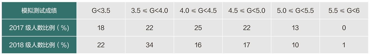 表2:2017、2018級中加合作辦學項目學生入學考試成績分布