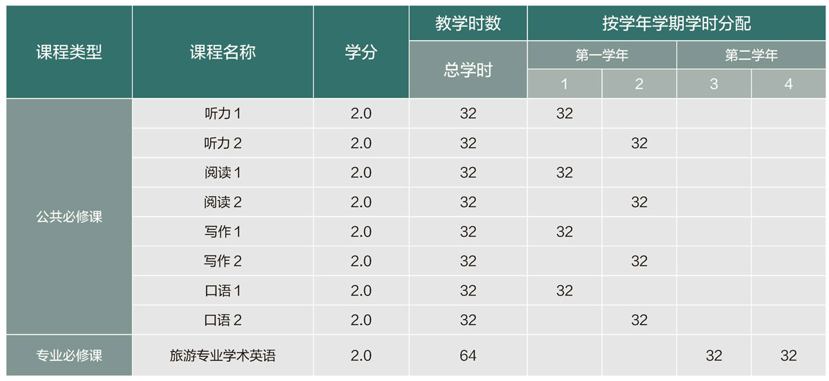 學院根據培養方案要求,為本項目學生一年級開設英語課程,每學期128課時,共計256學時;二年級每學期開設旅游專業學術英語課程32課時,共64學時(見表1)。根據中加合作辦學項目的培養方案要求,只有專業和英語水平均達到圣文森山大學要求的學生方可申請第四年赴圣文森山大學學習。圣文森山大學對學生的英語水平考核以雅思成績為準,要求總分達到6.5分水平,且單科不低于6.0(其他國際認可的同等英語考試成績也可以接受)。
