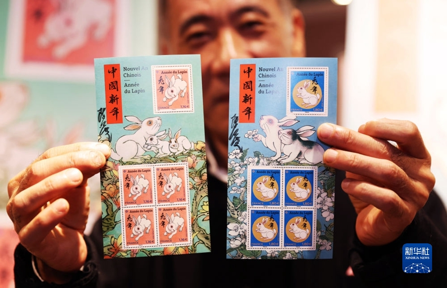 2023年1月14日,在法國巴黎舉行的兔年生肖郵票發行儀式上,郵票設計者陳江洪展示兔年生肖紀念郵票。新華社記者 高靜 攝