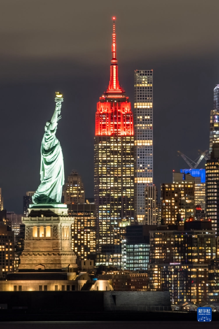 2023年1月20日,美國紐約帝國大廈亮起中國春節主題燈光。新華社發(周煥新攝)