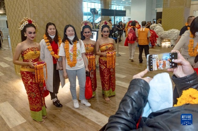 1月22日,在印度尼西亞巴厘島伍拉萊國際機場,中國游客與歡迎儀式上的舞蹈演員合影。旅游勝地巴厘島當天迎來2023年首架中國游客包機。新華社發(比辛拉西攝)