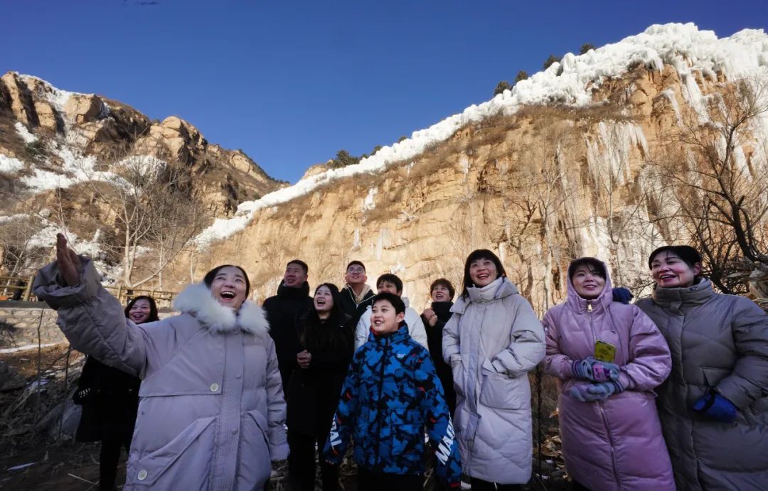 冬日清晨,河北阜平縣龍泉關鎮駱駝灣村迎來日出,村民在為游客講解太行山獨特的“日照冰瀑”景觀。人民日報記者 李舸 攝