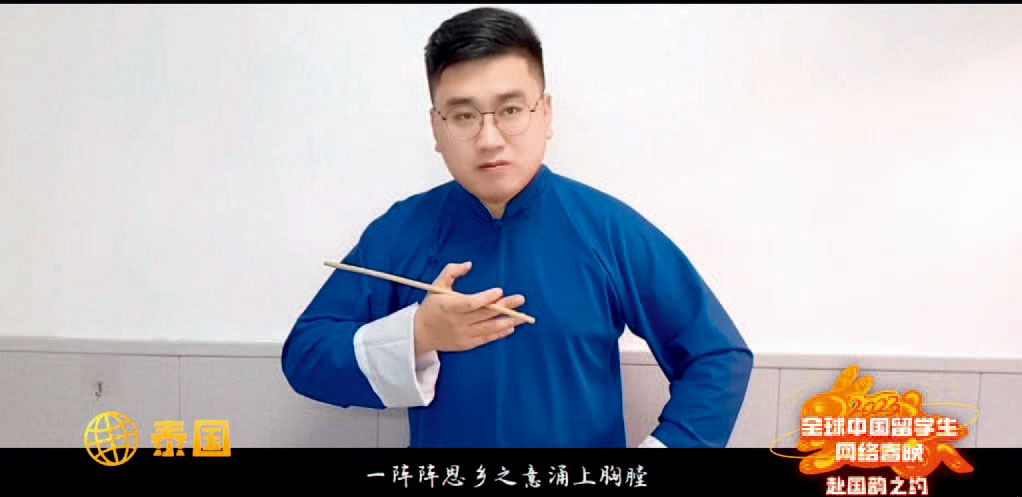 泰國宣素那他皇家大學碩士生肖博的《學子思鄉(xiāng)》以傳統(tǒng)的曲藝形式東北大鼓,抒發(fā)了一名海外學子對祖國家鄉(xiāng)、父母親人的思念