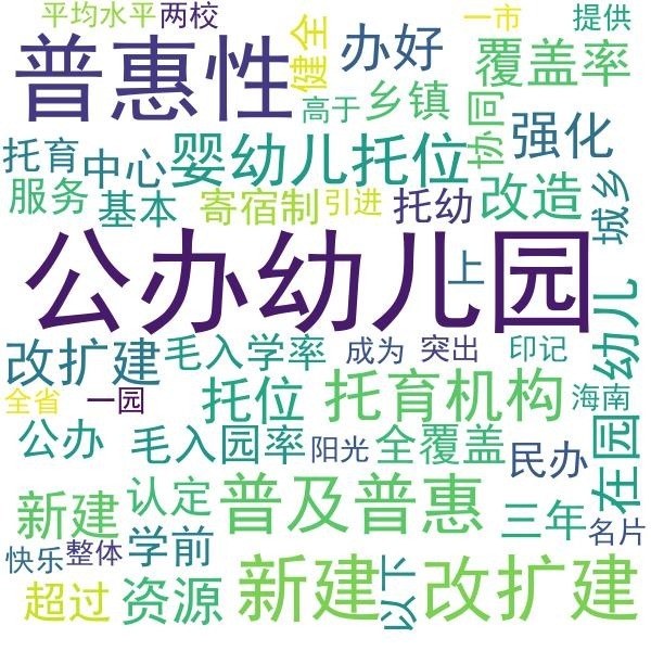 進一步分析發現,這些高頻詞關聯的學前教育重點內容包括:新改擴建公辦幼兒園、新建托育機構、新增幼兒園學位、嬰幼兒托位,完善普惠性學前教育。