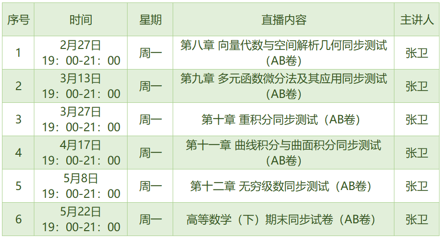 2月27日晚19:00,高等數學(下)同步測試卷精講第一期正式上線!題不在多,而在精。拒絕題海戰術,學會舉一反三,才是有效刷題。張衛老師帶大家從題目出發,總結做題思路,帶大家走出“做不出題”的高數困境。