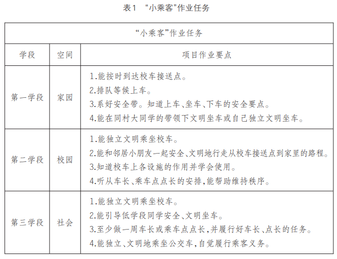 以“小乘客”作業任務為例:山村學生散居于各個村岕,上下學需要校車接送。“小乘客”體驗項目充分發揮學生自我教育的優勢,讓學生自覺進行自我認識、自我督促、自我克制、自我改正,從而形成良好的公共秩序素養。(“小乘客”作業任務見表1)