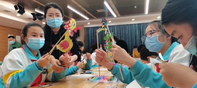 天津市南開區少年宮教師指導學生制作皮影。徐德明 攝