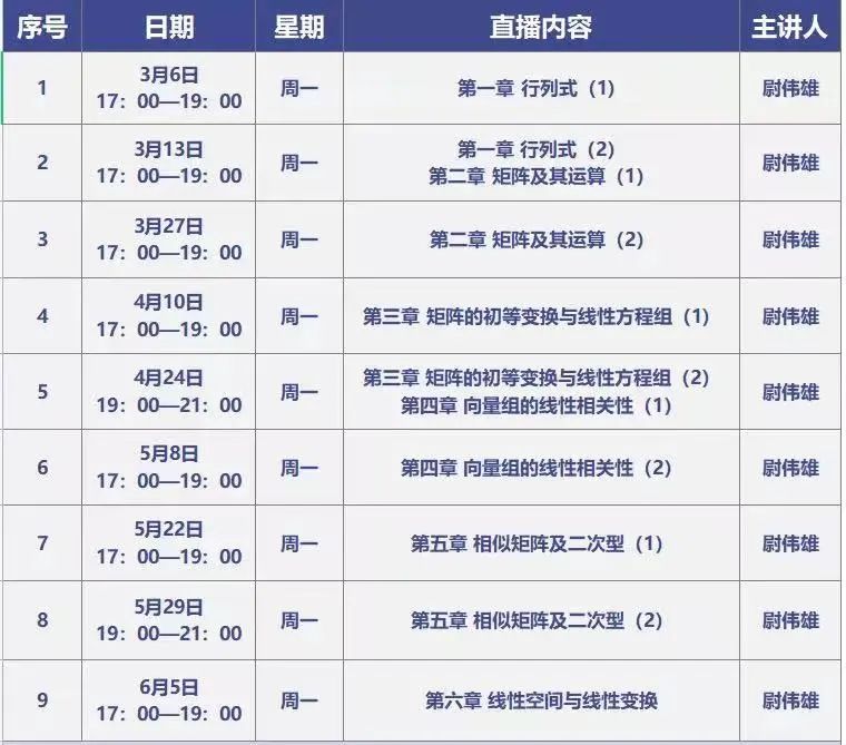 下期預(yù)告:4月10日17:00-19:00,第三章 矩陣的初等變換與線性方程組(1),敬請(qǐng)期待。