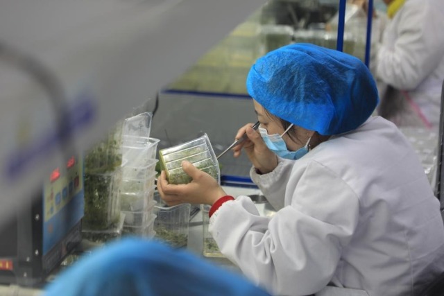 3月2日,在定西市渭源縣五竹馬鈴薯良種繁育專業合作社,工作人員正在進行馬鈴薯脫毒苗切段繁育。新華社記者張智敏 攝