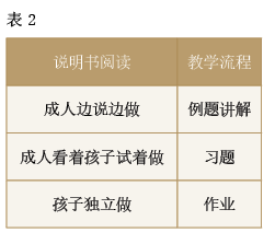 成年人拿到產(chǎn)品說明書時,會自己邊閱讀邊操作,直至熟識。如果是孩子呢?因為孩子識字不多,無法完成說明書的閱讀。于是,成人便會邊說邊操作,也即示范一下,然后讓孩子試著做一遍,成人在邊上看著。如果操作不對,成人會再來一遍。最后孩子熟練了,便算教好了。這個成人代為閱讀的說明書,與我們的教學(xué)對應(yīng)起來,是這樣的(見表2)。