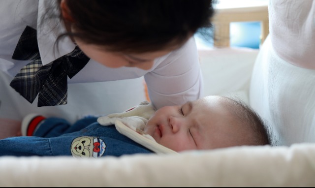 4月25日,萬戶新村托育園乳兒班5個(gè)月的薇薇寶寶在老師的安撫下睡著了。