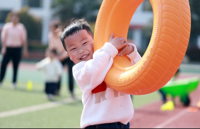 4月24日,萬戶新村托育園托大班金霖寶寶在戶外活動(dòng)中抱著自己最喜歡的彩色輪胎。