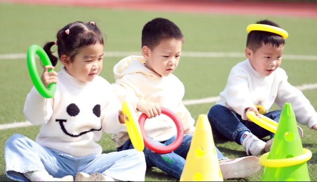 4月25日,萬戶新村托育園托大班的寶寶們正沉浸在有趣的套圈游戲中。