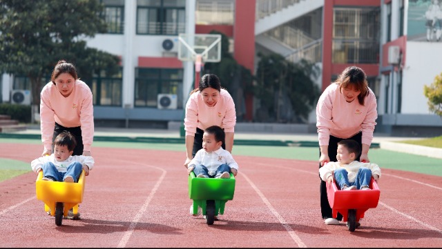 4月25日,萬戶新村托育園老師們帶著托小班的寶寶進(jìn)行獨(dú)輪小推車比賽。