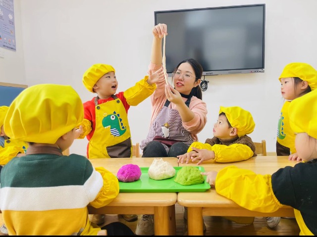 4月25日,萬戶新村托育園托小班希希老師正帶著寶寶們開展彩色面條主題食育課程。