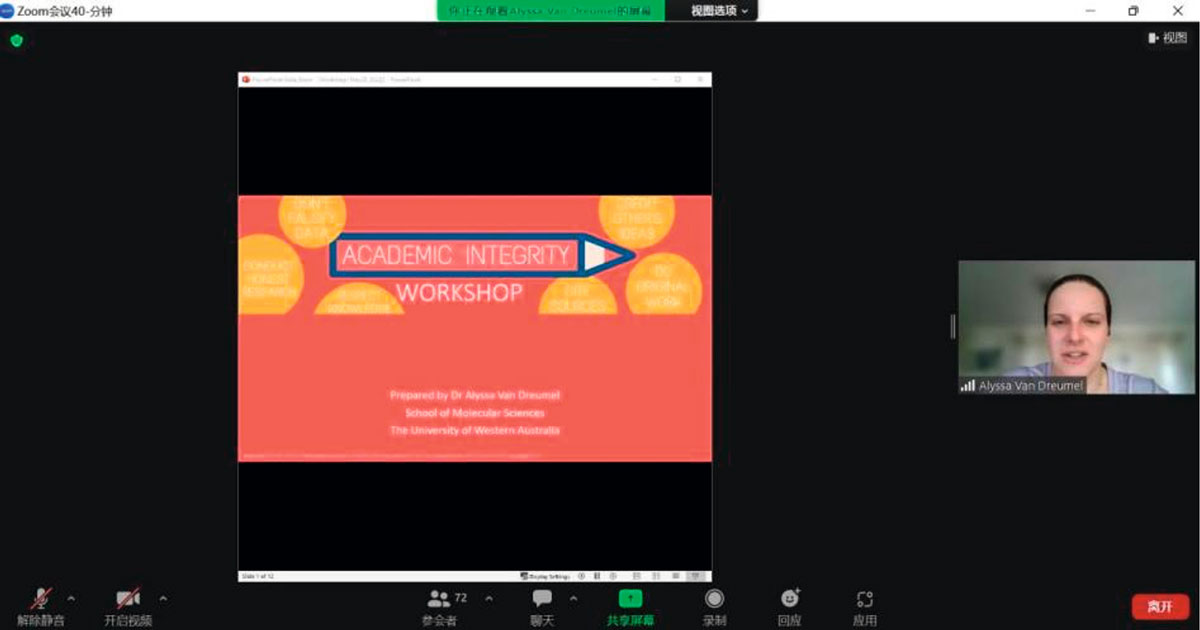 再次,通過該課程中外雙方共課教師的充分溝通,逐步達成協同開展課程思政的共識。外方共課教師有意愿和熱情在加強學生學術誠信教育、培養嚴謹治學態度等方面協同參與相關工作,并通過專題講座、課堂研討、課后交流等形式向學生傳遞正確的學術觀和職業操守。如外教在授課過程中,協同中方老師針對學術誠信問題開展在線專題講座(如圖),幫助學生培養正確的學術誠信思維和學術規范。