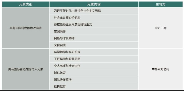 要打通要素堵點,首先應充分挖掘育人元素,形成具有中外合作辦學特色的課程思政元素體系。為切實消除外方對課程思政的認知誤區,在教育實踐中要著重區分具有國際普適性的育人元素(如科學精神、社會責任、誠實守信等)和具有中國特色的思政元素(如社會主義核心價值觀、家國情懷、理想信念等),從中外雙方形成共識的普適性元素入手,系統分析國際教育界開展思政育人的共同點和相近點,充分挖掘國際普遍認同的育人元素,形成具有雙方共識且有利于中外合作辦學持續健康發展的課程思政元素體系。