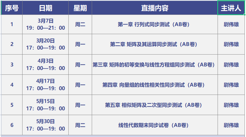 5月30日,“高等數學伴學計劃”線性代數同步測試卷精講最后一講即將上線,尉偉雄老師將助力你破解線性代數難題,成功通關。