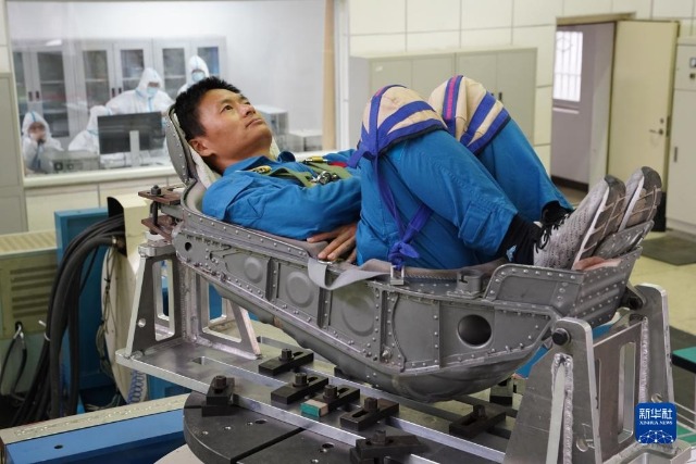 神舟十六號航天員朱楊柱在進(jìn)行振動體驗(yàn)(2022年4月27日攝)。新華社發(fā)(王夏陽 攝)