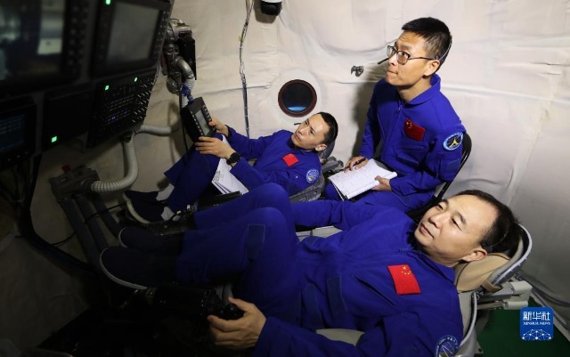 神舟十六號航天員乘組在飛船模擬器中(2023年5月8日攝)。新華社發(fā)(徐部 攝)
