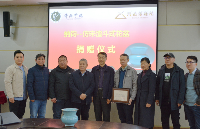 2021年2月5日,許昌學院把納米鈞瓷科研團隊與著名陶瓷藝術家劉志軍合作燒制的“納鈞—仿宋渣斗式花盆”捐贈給河南博物院,供河南博物院收藏、展示與研究之用。該作品將現代納米科技與鈞瓷文化傳承貫穿融合,通過科技對傳統工藝的改進與提升,更好地展現了仿宋鈞官窯的古樸典雅與釉潤如玉之美。