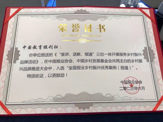 中國教育報刊社報送的《“宣講、送教、報道”三位一體 開展服務鄉村振興品牌活動》,入選55個“全國報業鄉村振興優秀案例”,中國教育報刊社成為50家獲獎的新聞單位之一。