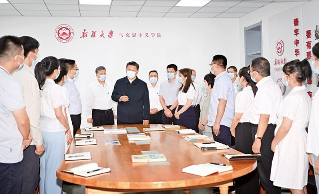2022年7月12日至15日,中共中央總書記、國家主席、中央軍委主席習近平在新疆考察。這是12日下午,習近平在新疆大學鑄牢中華民族共同體意識研究基地,同師生親切交流。 新華社記者 李學仁/攝