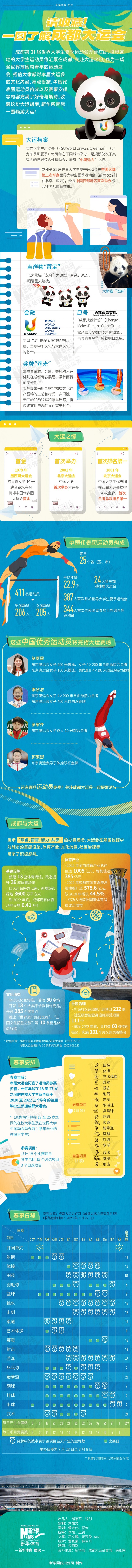 成都第31屆世界大學生夏季運動會開幕在即,世界各地的大學生運動員將匯聚在成都,共赴大運之約。作為一場全世界范圍內青年的運動盛會,相信大家都對本屆大運會的文化內涵、亮點設施、中國代表團運動員構成以及賽事安排等內容充滿了好奇與期待。收藏這份大運指南,新華網帶你一圖暢游大運!